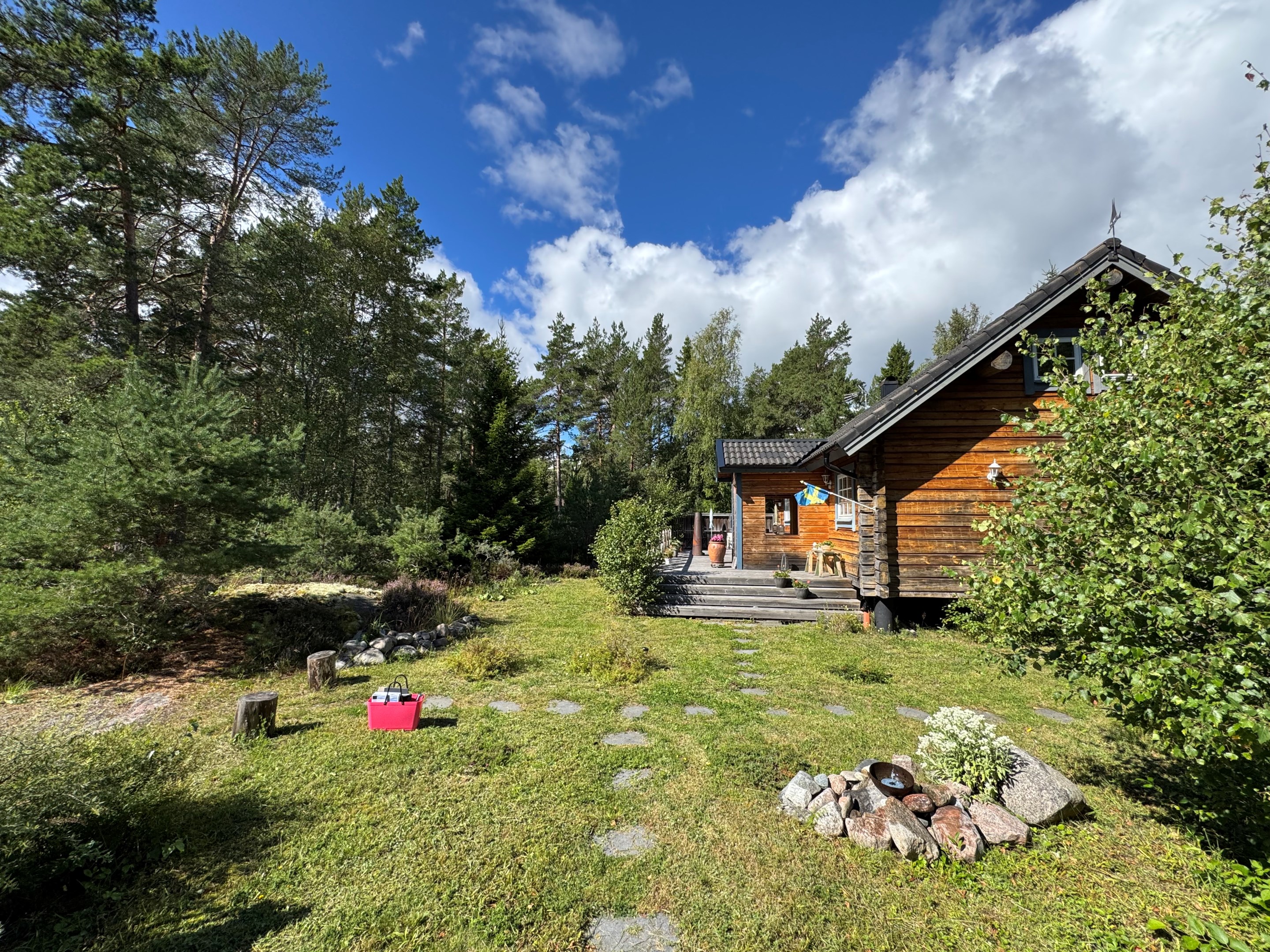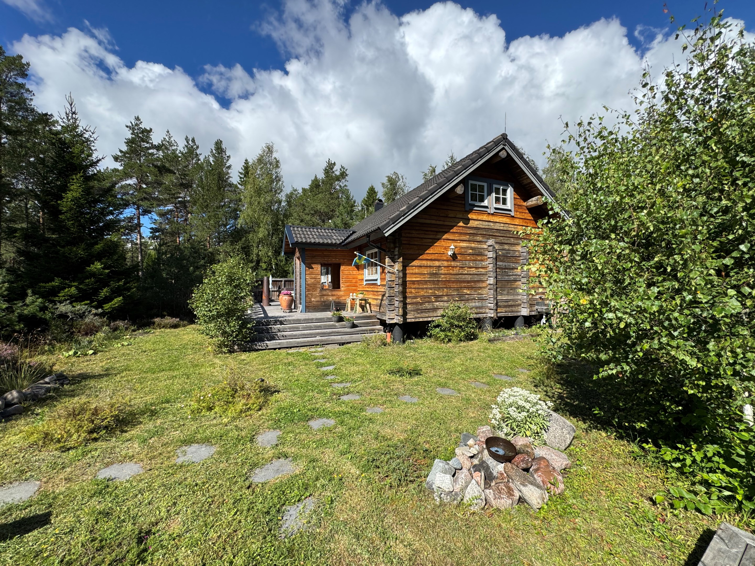 Ett charmigt timmerhus i blåbärsskogsmiljö