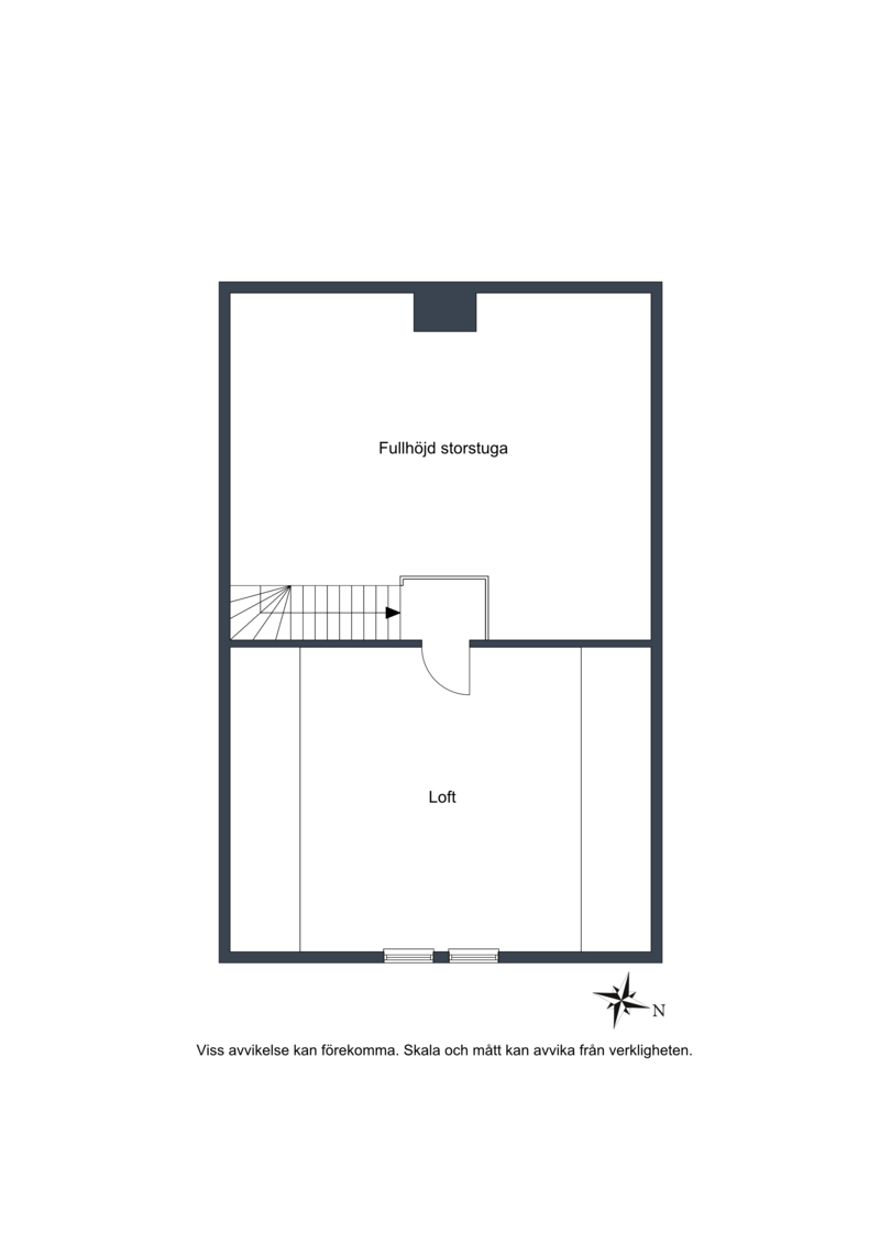 Halva husets yta har loft med full ståhöjd på mitten. På varsin sida längsmed snedtaket finns mycket bra förvaringsytor, gömda bakom gardrobsskjutdörrar. Plats för dubbelsäng med en vacker halvmåne till glas ovanför sängram vilket gör denna yta till master bedroom.