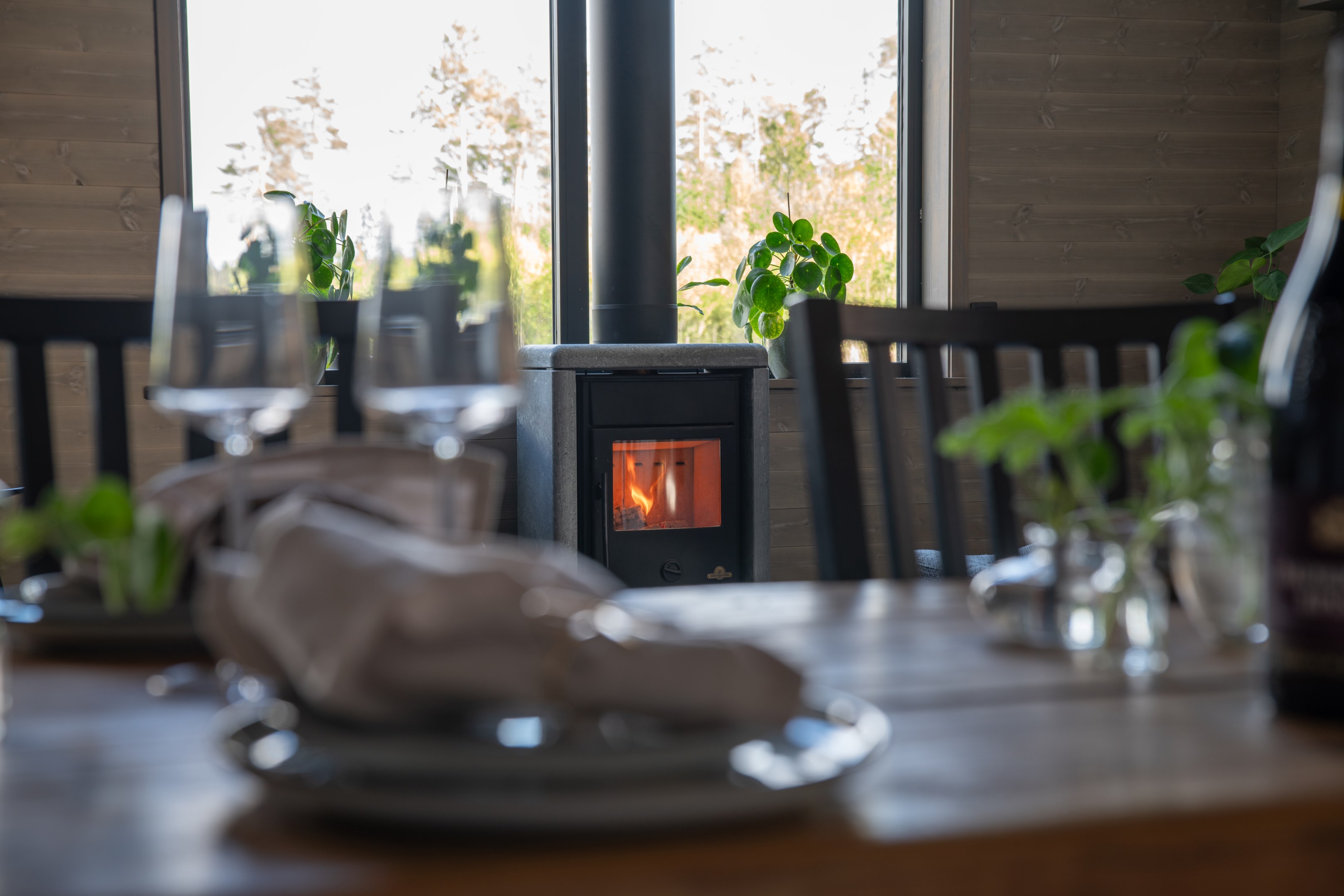 Praktiskt tvättstuga med ingång via köket. En altandörr leder ut till uterummet. Ljusa väggar klädda i våtrumstapet. Golvet har en våtrumsmatta. Vädringsbart fönster. Rostfri diskho samt arbetsyta i laminat. Electrolux tvättmaskin och torktumlare, år 2014. Frånluftsvärmepump, NIBE F750 (Energiklass A++), med värmeåtervinning. I pannan hanteras både varmvatten och uppvärmning. Ett uterum med svarta profiler och öppningsbara glaspartier gör att du kan förlänga utesäsongen. Plats för matbord med utsikt över vattnet.