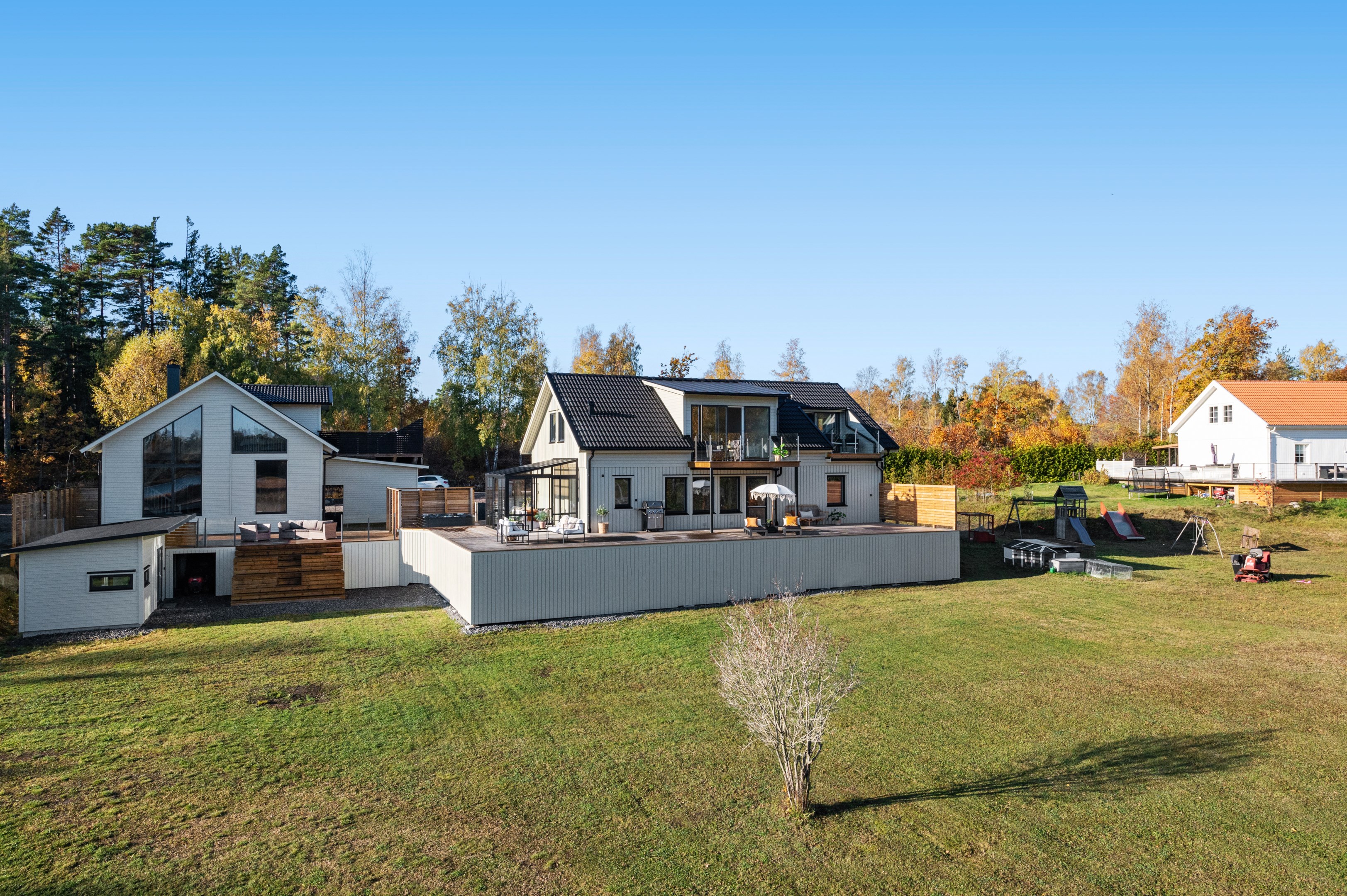 En känsla av sjötomt? Absolut! Med havsnära läge och utsikt över Åkeröfjärden finner vi denna fastighet med två separata bostäder och garage. Ett servitut ger både båtplats och rätt att hålla öppet ner till stranden. Vill du bo närmare natur och hav och komma bort från stress och asfalt? Då ska du verkligen läsa vidare! I populära Nänninge, alldeles intill havet finns två fristående hus som är fullt utrustade för åretruntbostad. Den ena villan på 7 rum fördelat på två plan har inretts med 5 sovrum, varav två sovrum finns på entréplan. Stora sociala utrymmen i form av rymligt kök och matplats liksom lättillgängligheten till en fin utemiljö i uterum och takterrass. Spabad och stora soldäck ger skön avkoppling utöver gräsmattan som inbjuder till lek och spel. Släck törsten genom kylröret som håller drycken kall medan kubbtävlingen är i full gång. Det lösvirkesbyggda gästhuset i två plan påminner om en lyxig fjällstuga. Ett extra bostadshus på 92 kvm med mysig tillvaro där kök och allrum med kamin skapar en samlingsplats. En trapp upp finner vi 3 sovrum , allrum med utgång till terrass och fullt utrustat badrum. Byggnaden inrymmer ett varmgarage om 30 kvm med golvvärme och brunn. För den biltokige är detta ett extra bra tillfälle att faktiskt få njuta av sin bil även inifrån huset, ta en titt så förstår du. Utanför finns en grillplats under tak. Under den stora takterrassen finns en stor carport med plats för båt. Intill den stora trapp som leder ner till gräset finns en inredd friggebod, ca 15 kvm, med separat sovrum och förberett för badrum. Även förberett för vattenburen golvvärme. Vägen ner till havsviken går via samfälld mark som delas med 6 st fastigheter till antal. Båtplats i skyddad vik med access till havet. På cykelavstånd kan du nå områdets två fina badstränder och även iläggningsramp för båt.
