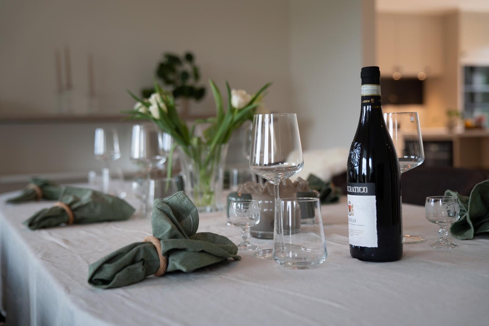 Ljus entre med klinkerlagt golv i grå nyans från Brickmate. Platsbyggd träbänk intill trappen upp till övervåningen. Likaså platsbyggd avhängning för kappa. Fint ljusflöde från matsalen. Belysning hall och kök Plejd styrd med varmt och kallt ljus