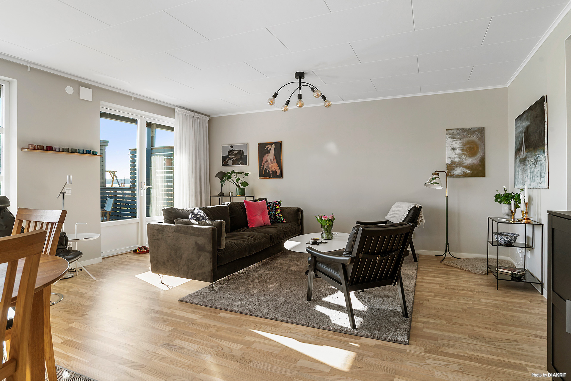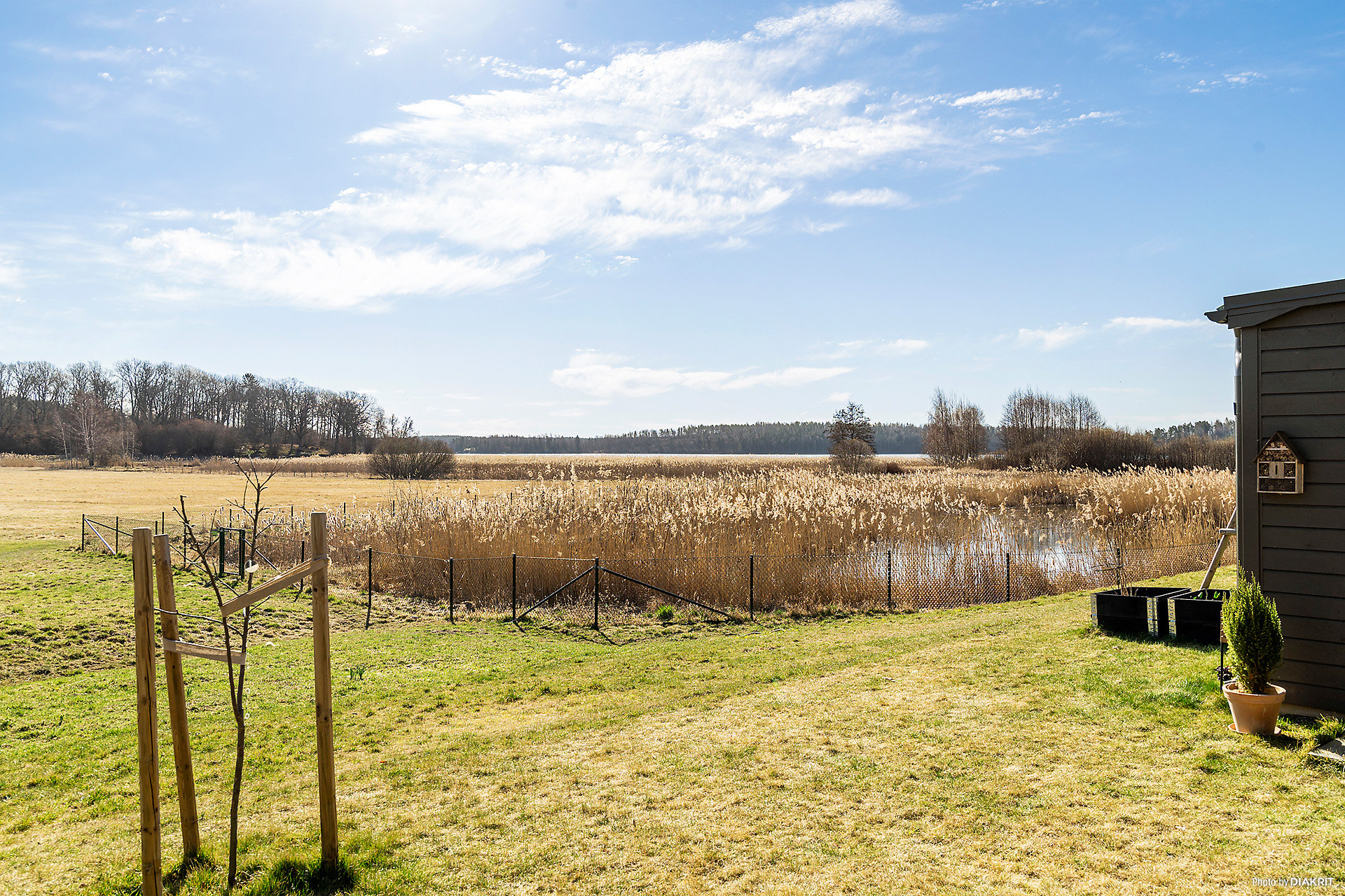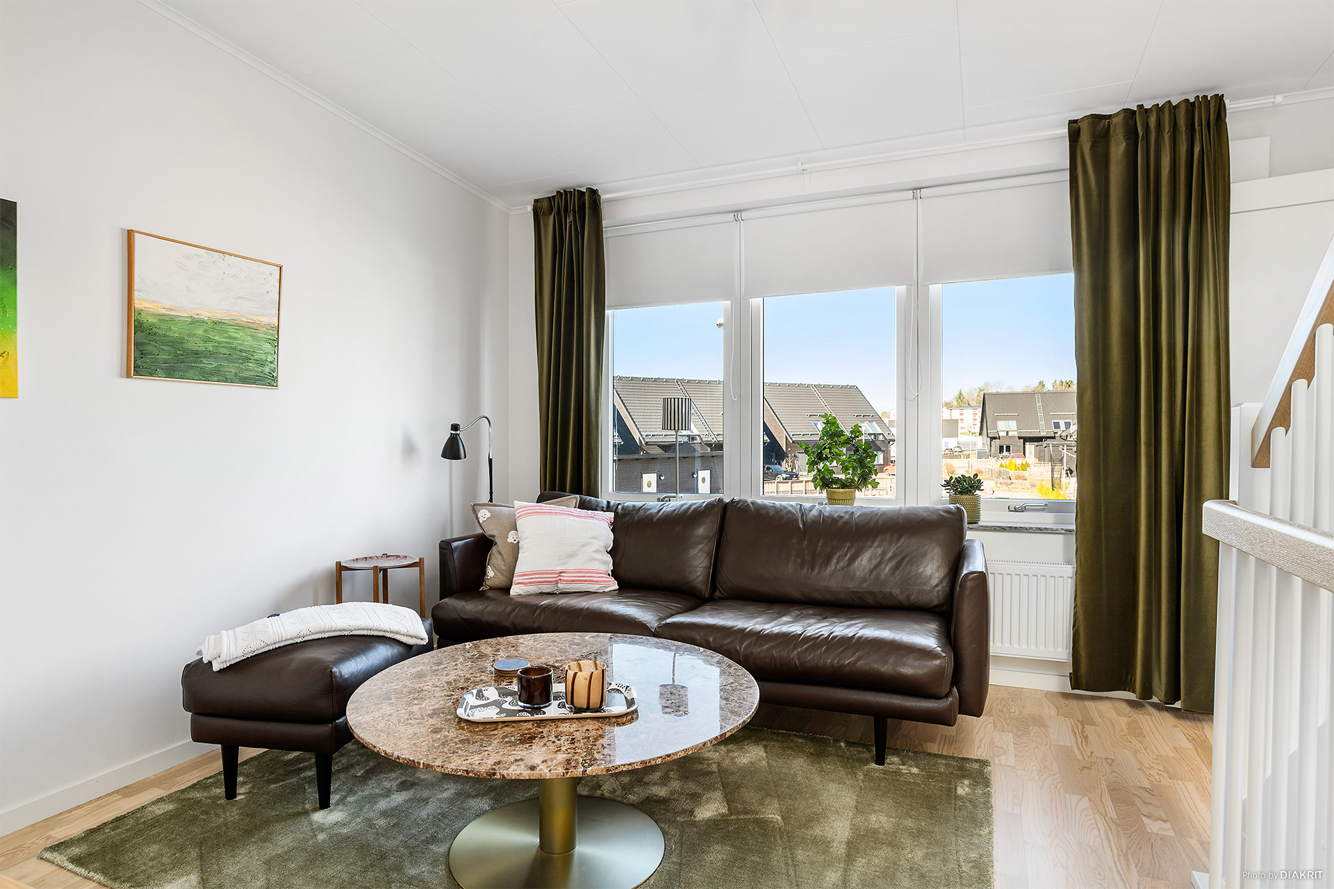 Ett riktigt läckert vardagasrum med plats för mys och middagar. Stora och spröjsade fönster och dubbeldörrar ut till en trädäckad altan som övergår till gräsmatta och utsikt mot Norrtäljeviken.