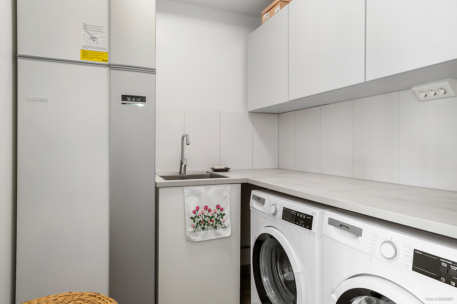 Tvättmaskin och torktumlare med bänkskiva med ho och överskåp. Husets uppvärmning i form av en frånluftvärmepump Nibe som hanterar golvvärme i entréplan och radiatorer en trapp upp. Golv och sockel med klinker. Stänkskydd av kakel. Vitmålade väggar.