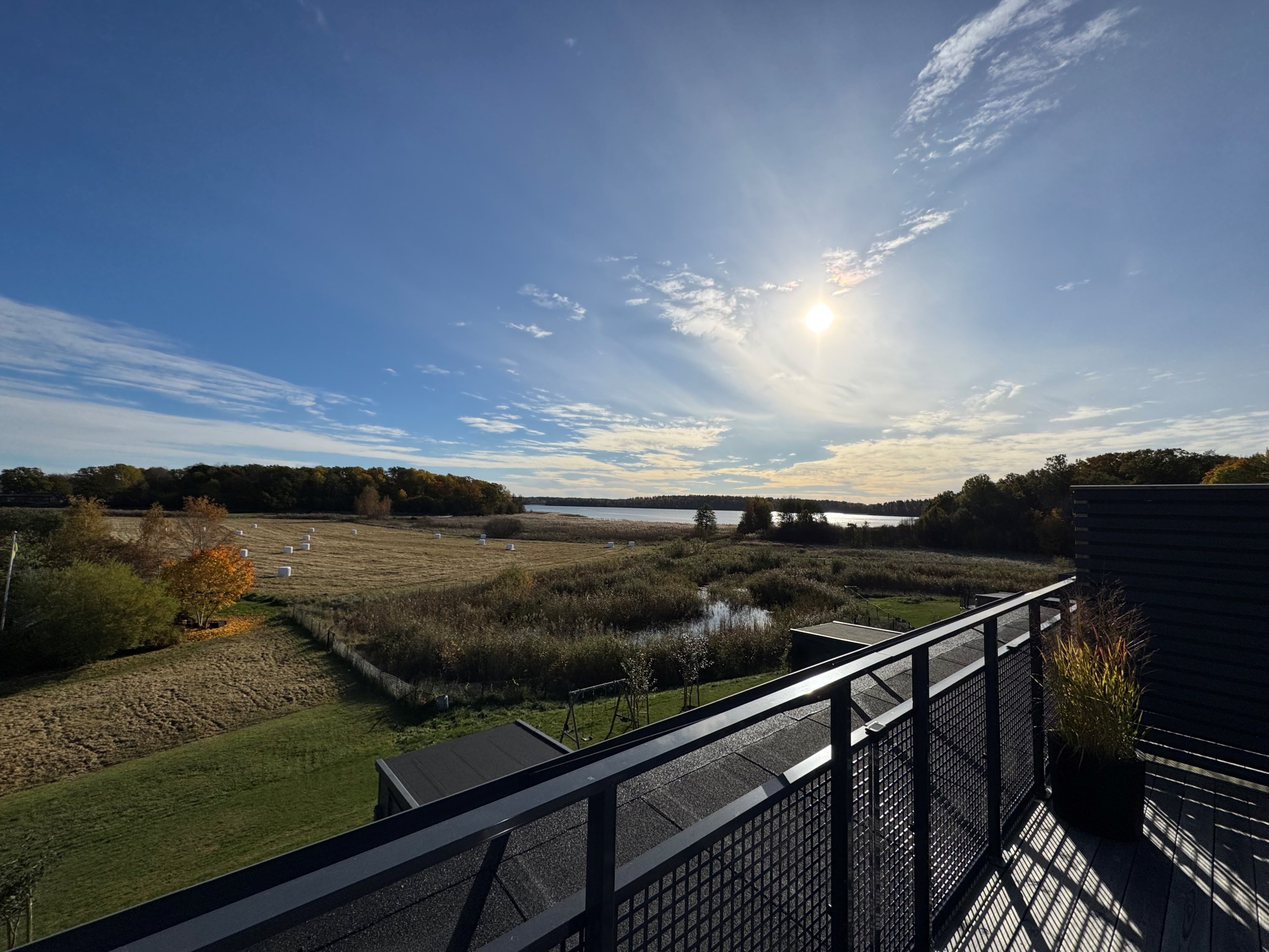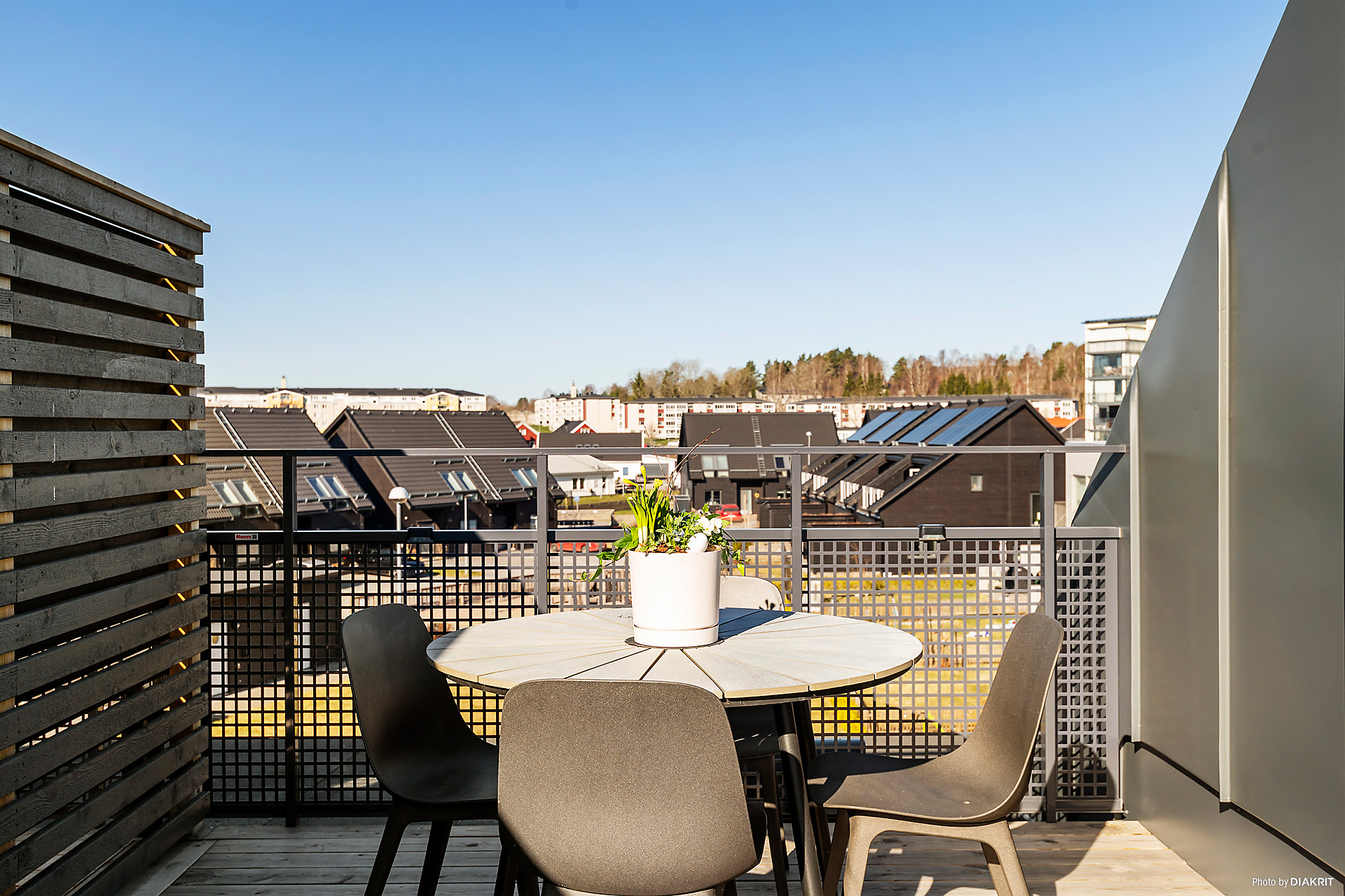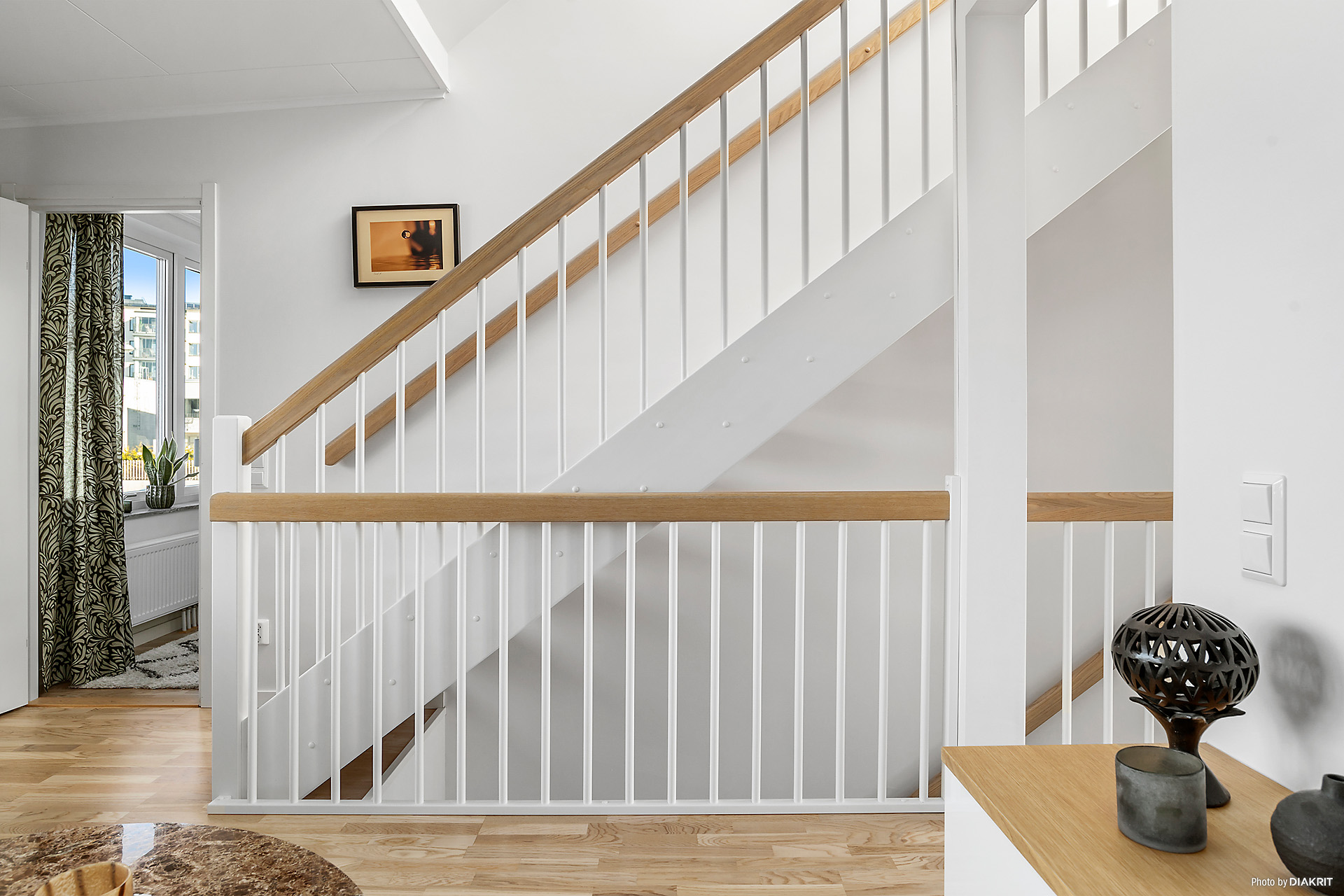 Du når takterrassen via den ekklädda trappen från allrummet. Varför inte skapa ett galleri på väggen upp. Njutbar terrass med trädäck, räcke av stål och avskärmning i trä mot grannen. Vy över Norrtäljevikens vatten och helt insynsskyddad.