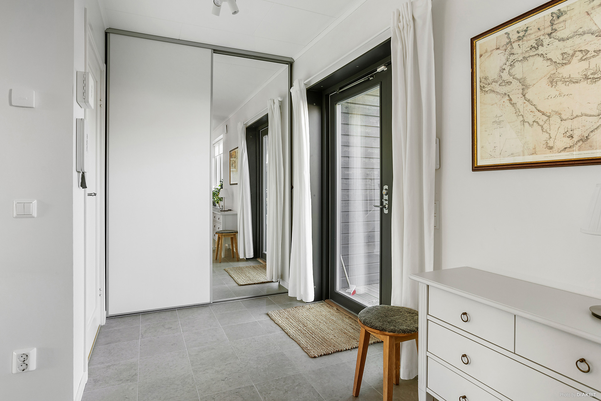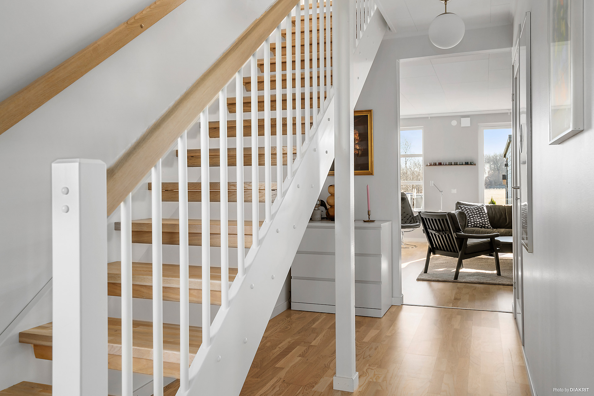 Välkommen in till en öppen och ljus hall med skjutdörrar med bakomliggande utrymme för klädförvaring och VS Skåp. Klinker på del av golv precis innanför den fina ytterdörren som släpper in ljus. Här har du full syn genom huset och välkomnas fint av både köket och vardagsrummets öppna planlösning. Trappen har placerats praktiskt mitt i huset med handledare och räcken i trä.