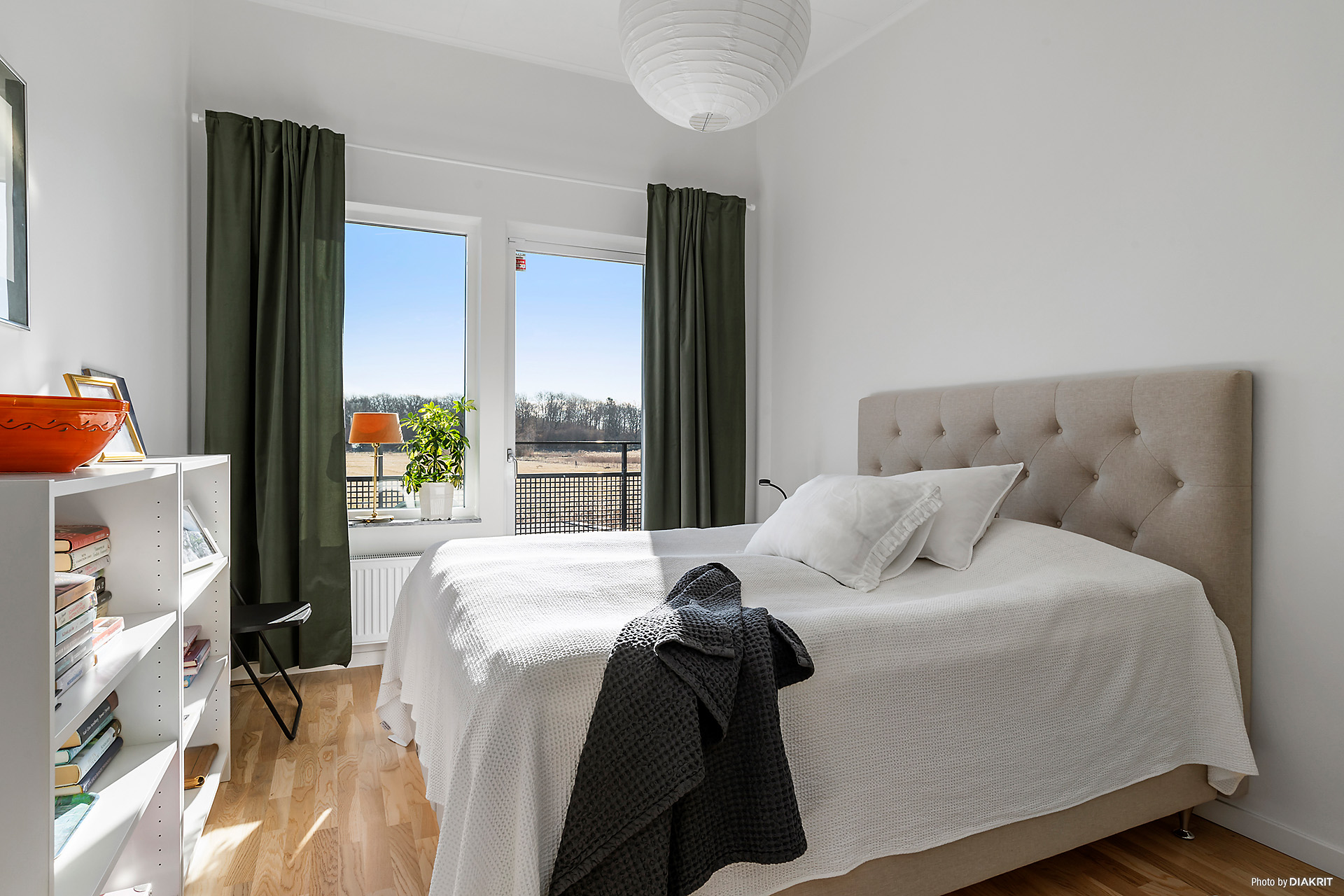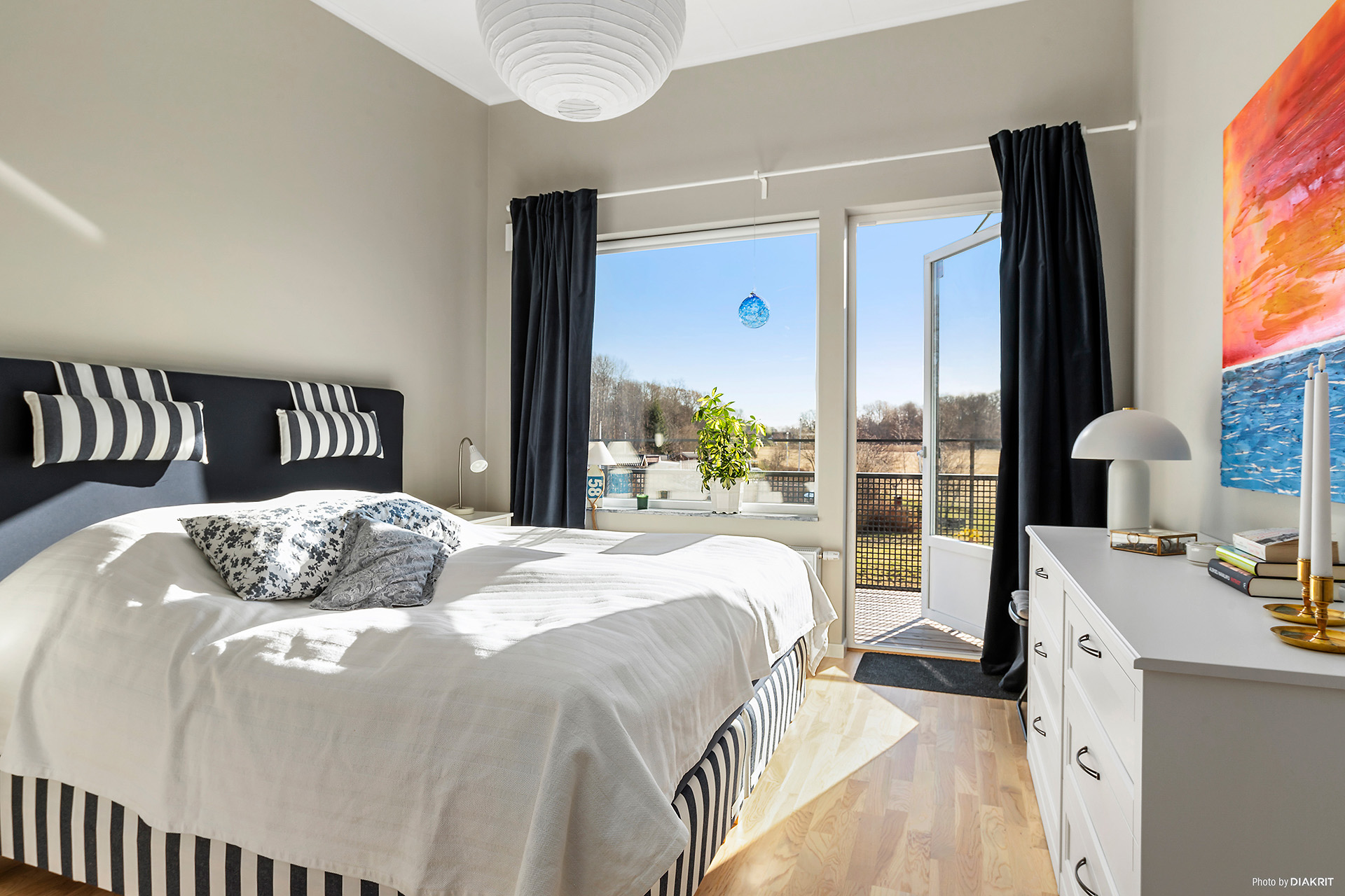 Sovrummen (1 och 2) i främre kanten mot vattnet är rymliga och har en takhöjd närmare 3 meter. Båda har access till balkongen. Här finns klädförvaring bakom platsbyggda garderober. Sovrum 3/Arbetsrum har fönster högre placerat på väggen. Enklare att möblera med en säng. Möjligt att ändra till två klädkammare med ingång från sovrum 1 och 4. Sovrum 4/TV rum har utgång mot allrummet på övreplan. Ett mysigt extra rum med fönster mot entrésidan.