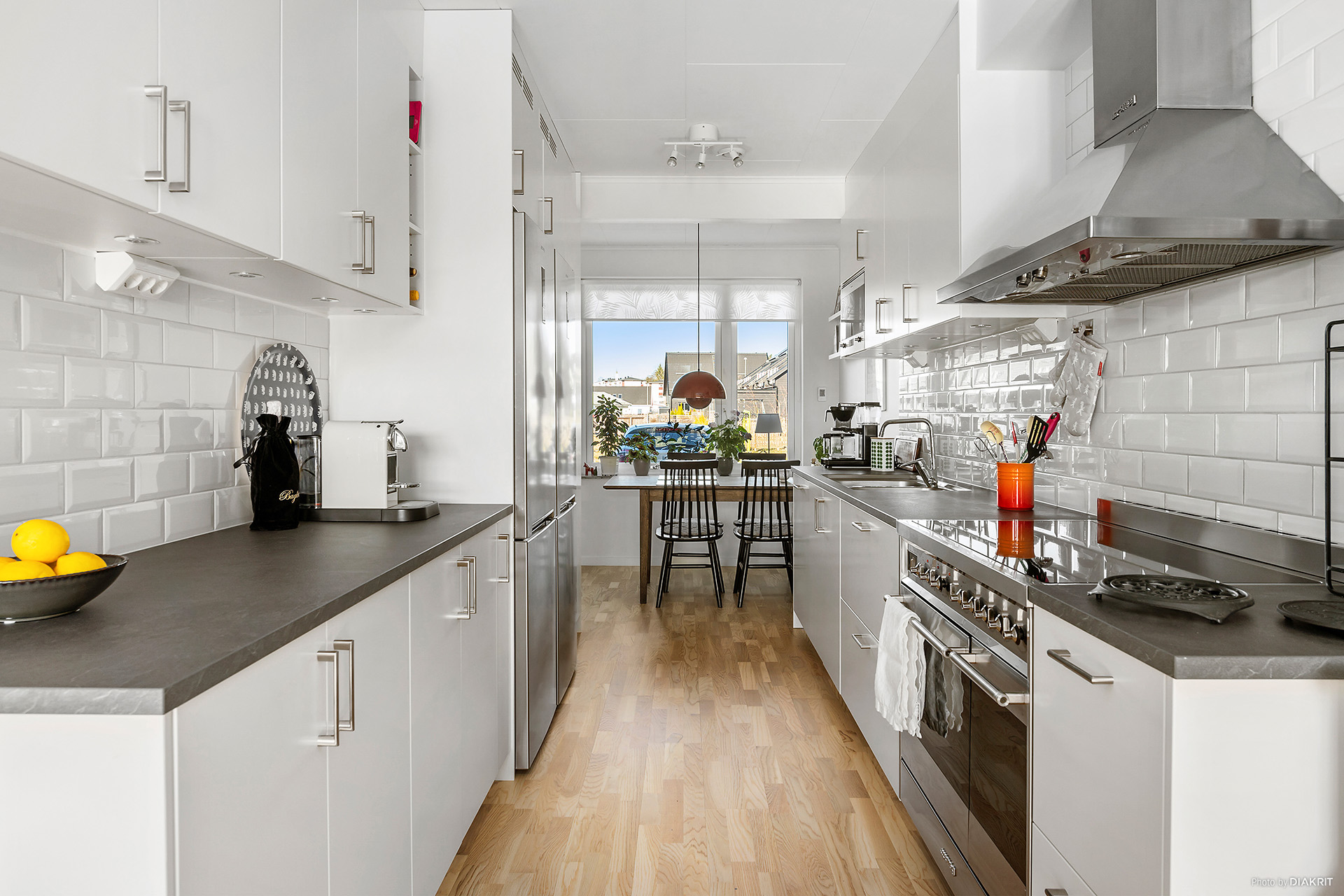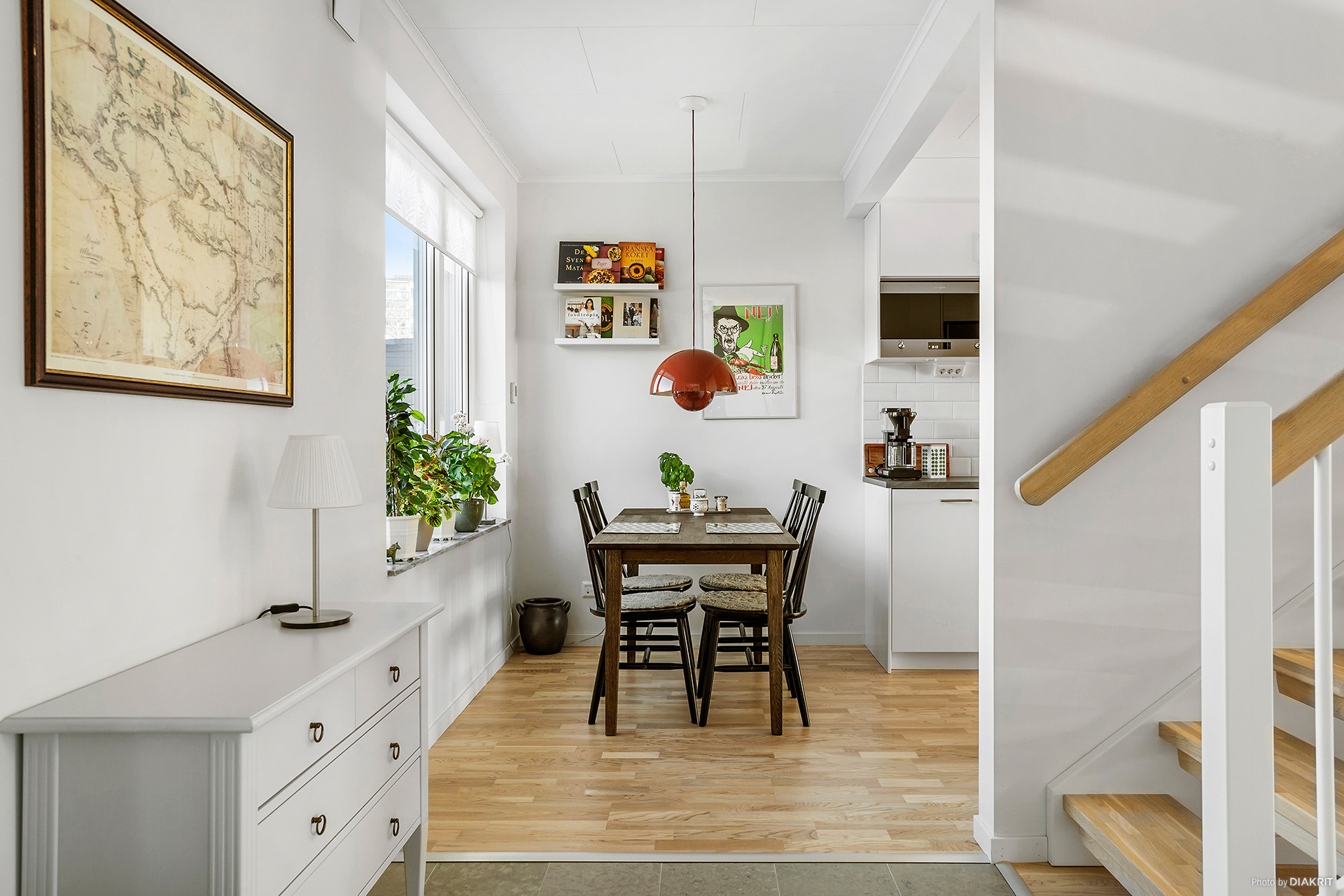 Via hallen når du en trivsam matplats för det mindre bordet. Här kan du inta frukost framför fönstret som vetter ut mot entrésidan. Köket blir som en förlängning och sammanlänkning mellan matplats och vardagsrum. Köksinredning vita släta luckor, bänkskiva av grå laminat med nedfälld ho. Två kombinerade kyl/frysar, spis med häll, mikro, fläktkåpa samt diskmaskin. Bänkbelysning med spotlights under väggskåp.