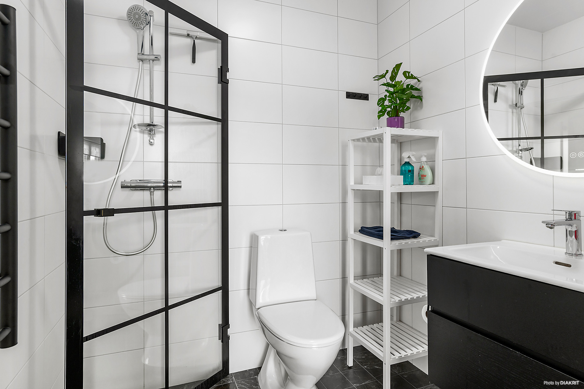 Lyxigt inrett duschrum med vitt kakel och svarta detaljer. Tvättställ med kommod med svart lådinsats, spegel med belysning. Duschvägg av glas med svart ram. Handukstork (el). Mörk klinker på golv. Golvvärme.