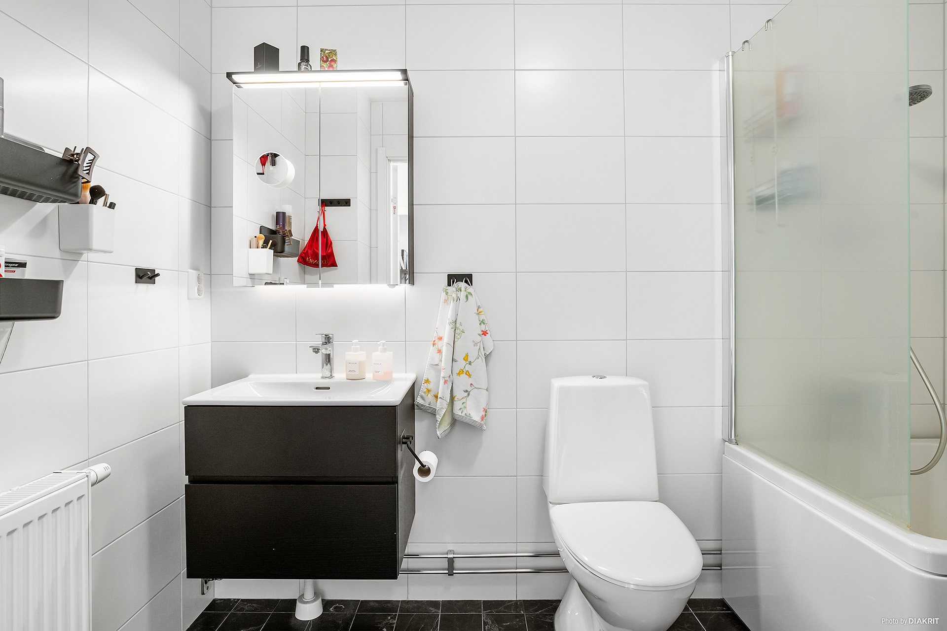 Påkostat badrum med helkaklade väggar i vitt. Mörkare klinkers på golvet med golvvärme(el). Installerat badkar. Tvättställ med kommodmed svart lådhurts, spegel med belysning.