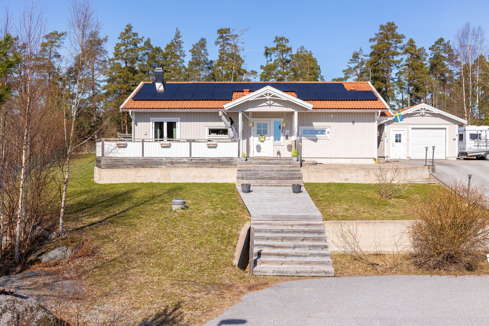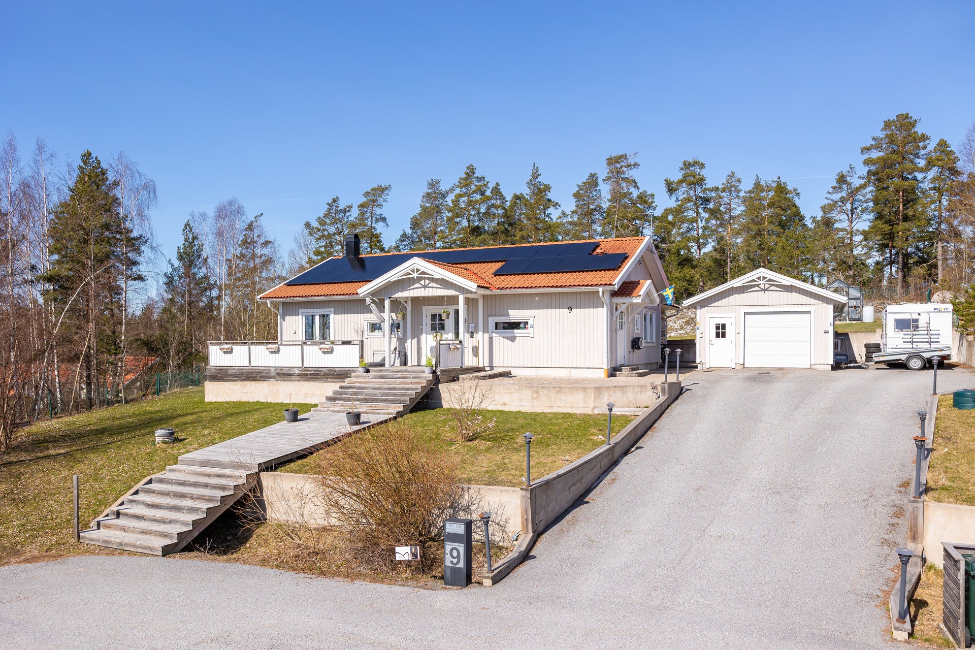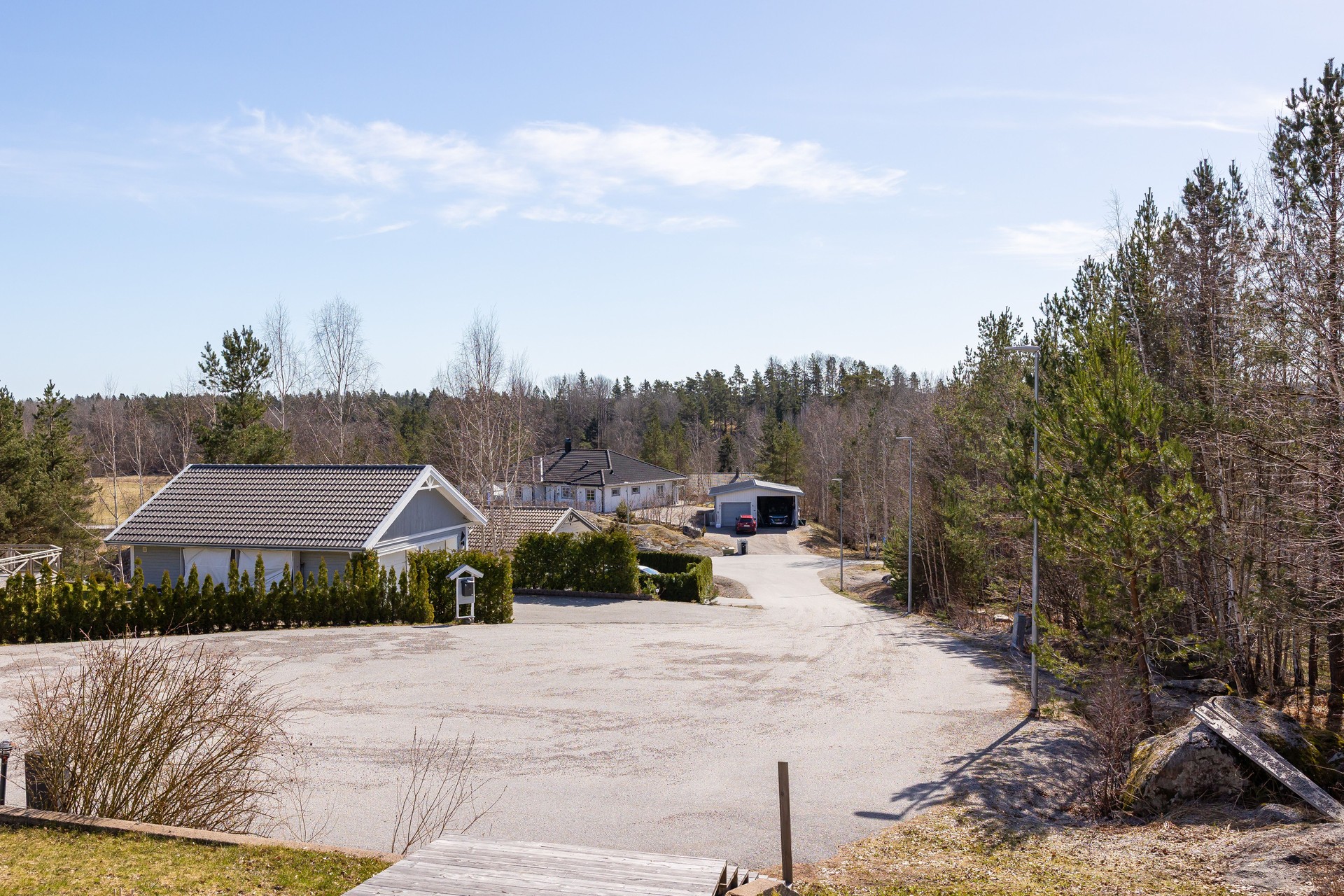På asfalterad uppfart för 2-4 bilar, bredvid garage finns plats för husbil/båt. I garage finns plats för 1 bil.Bredband