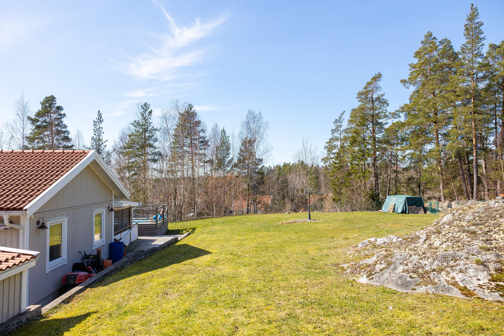 Tomten har access mot kommunens skog. Gräsklädd. Uppmurad stödmur. Omgärdad av staket, perfekt för djurfamilj.